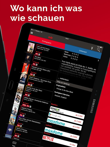 Morgen läuft eine Sendung, die Sie auf keinen Fall verpassen möchten? Kein Problem. Die tele TV App zeigt ihnen nicht nur das aktuelle TV-Listing, sondern erinnert Sie an ihre Lieblingssendungen zur rechten Zeit. Fügen Sie Serien, Fernsehsendungen oder Filme zu ihrer persönlichen Fernsehliste hinzu. Die Alarm-Funktion lässt Sie keine Sendung mehr verpassen.