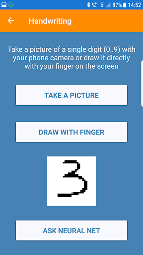 Nutzen Sie dazu die eingebundene MNIST Datenbank, die 40.000 handgeschriebene Zeichen enthält. Zudem ist es möglich, das Netz mit der eigenen Handschrift zu schulen, indem Sie Ziffern mit der Handykamera aufnehmen oder direkt auf dem Screen Ihres Devices schreiben.