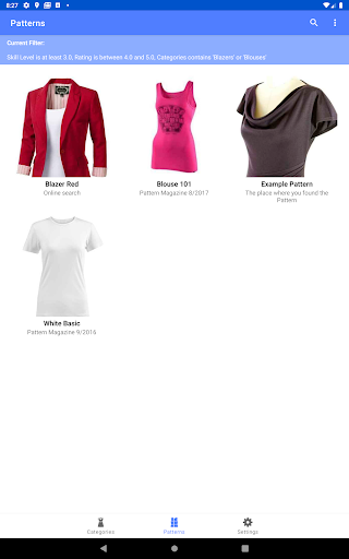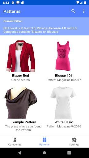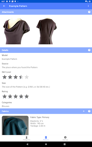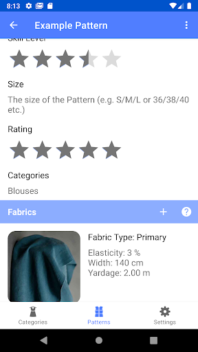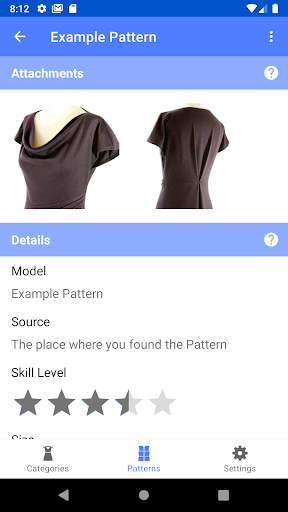 Mit der App können Sie den perfekten Überblick an einem einzigen Ort erhalten, unabhängig davonIhre eigenen Kreationen vollständig.Sie können Ihre Muster kategorisieren, basierend auf Standard -Kleidungsstypen, oder so viele Ihrer eigenen Kategorien erstellen, wie Sie möchten.Sie können Ihre Muster alphabetisch sortieren lassen, durch die letzte Verwendung oder in einer bestimmten Reihenfolge, die Sie mögen.Jedes Muster kann mit so vielen Kategorien zugeordnet werden, wie Sie möchten.in der integrierten Filterfunktion.Beim Durchsuchen Ihrer Muster werden nur die ausgefüllten Informationen angezeigt, sodass Sie sich nicht mit vielen Empy-Feldern befassen müssen.Modell, die Anweisungen oder vielleicht die endgültigen Kleidungsstücke.Sie können so viele Bilder hinzufügen, wie Sie möchten, sowohl für Ihre Kategorien als auch für Ihre Muster.