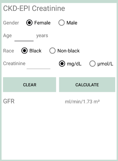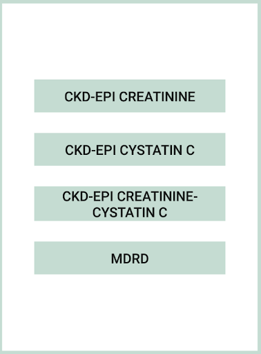 Sie können eGFR mit 4 Gleichungen berechnen. CKD-EPI Creatinine CKD-EPI Cystatin C CKD-EPI Creatinine-Cystatin C MDRD