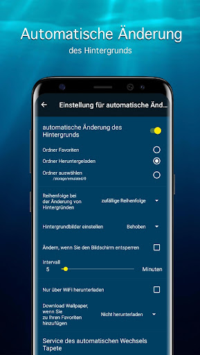 In der Anwendung wird eine automatische Hintergrundänderung Funktion (Live-Wallpaper) implementiert. Sie können die Quelle und das Intervall der Änderung selbst auswählen. Fügen Sie einfach die 4K Hintergründe zu Favoriten hinzu, ankreuzen Sie die entsprechende Position der Einstellungen und erfreuen Sie sich. Ihre allen gefallenden Fisch Bilder werden sich auf dem Desktop und Sperrbildschirm im Wechsel ändern!