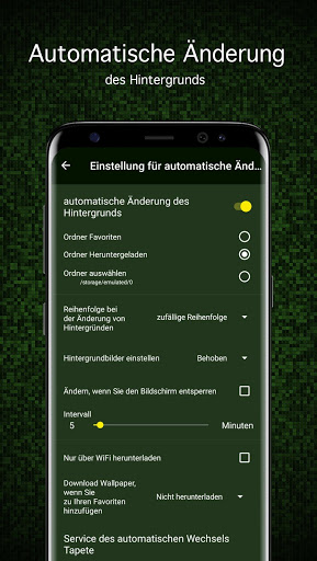 In der Anwendung wird eine automatische Hintergrundänderung Funktion (Live-Wallpaper) implementiert. Sie können die Quelle und das Intervall der Änderung selbst auswählen. Fügen Sie einfach die 4K Hintergründe zu Favoriten hinzu, ankreuzen Sie die entsprechende Position der Einstellungen und erfreuen Sie sich. Ihre allen gefallenden grüne Bilder werden sich auf dem Desktop und Sperrbildschirm im Wechsel ändern!