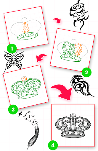 - Complete and step-by-step guidelines for art work in this tattoos drawing app