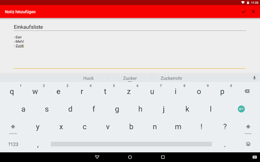 Damit du nie den Überblick über deine verschiedenen Notizen verlierst, werden diese alphabetisch oder chronologisch sortiert in einer Liste angezeigt. So findest du immer schnell, wonach du suchst. Du kannst auch ein Backup deiner aktuellen Notizen anlegen. Dieses wird dann als Textdatei auf die SD-Karte abgelegt. So kannst du auch vom Computer aus auf deine Notizen zugreifen und diese bearbeiten. Selbstverständlich kannst du eine solche Backup-Datei auch wieder in die App laden. Du kannst auch einzelne Notizen an einem anderen Ort auf dem Gerätespeicher ablegen. Wenn du dann eine externe Synchronisations-App verwendest, kannst du deine Notizen ganz einfach mit anderen Personen synchronisieren.