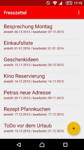 Mit dieser App kannst du deine täglichen Notizen intuitiv und übersichtlich verwalten. Fresszettel ist und bleibt kostenlos und werbefrei und verlangt keine Berechtigungen außer dem Zugriff auf die SD-Karte. Diese Berechtigung wird benötigt, falls du ein Backup deiner Notizen auf der Speicherkarte anlegen möchtest.