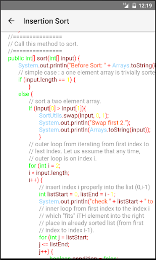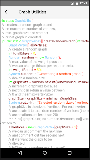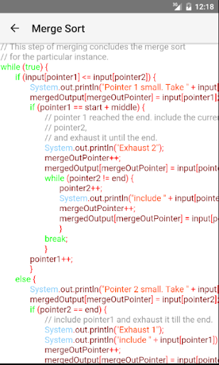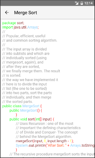 Presently the app contains implementations of popular algorithms and data structures in Java. We plan to add on more content in future. A list of code samples in the app: