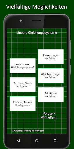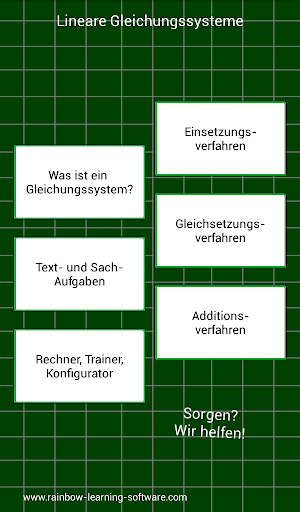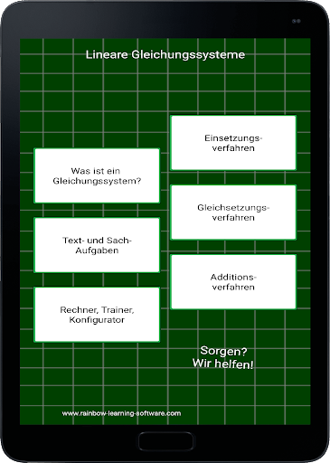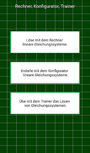 Das Programm enthält außerdem einen Rechner zum Lösen linearer Gleichungssysteme, einen Konfigurator zum Erstellen neuer Gleichungssysteme und einen Trainer.