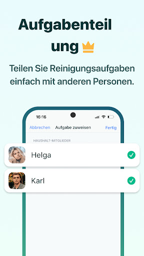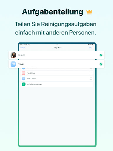 Du kannst die Reinigungsaufgaben sogar zwischen Hauspersonal oder Haushaltsmitgliedern aufteilen und den Fortschritt überwachen.