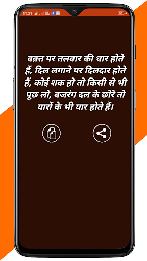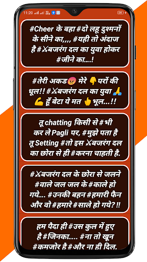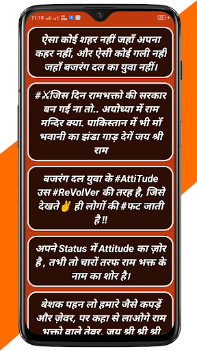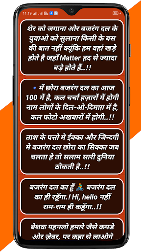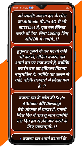 Sehr einfach zu bedienende Benutzeroberfläche streichen Sie einfach nach unten, um den besten Live-Bajrang Dal Attitude-Status in Hindi zu lesen, und legen Sie das einfach als Ihren Hindi WhatApp-Status oder den FB-Bajrang-Dal-Status ein.