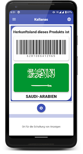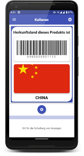 Mit dieser Anwendung können Sie den Ursprung des Produkts schnell durch Scannen des Barcodes identifizieren. Dann präsentiert sich das Ergebnis schön als Landesflagge und Landesname.