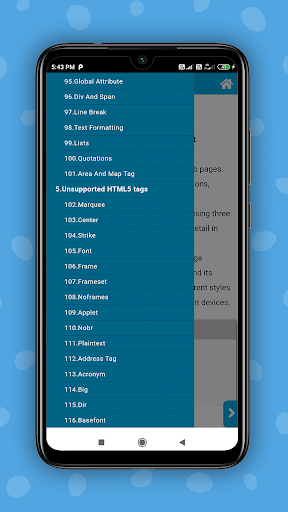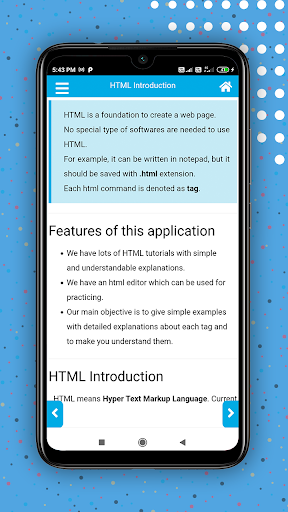 Diese App hilft Ihnen, die HTML-Webentwicklung auf einfache Weise zu lernen, dass Sie beispielsweise alle Arten von HTML 5-Tags und HTML-Tags erfahren können. Diese App wird Ihnen beibringen, wie Sie Webseiten und Websites mithilfe von HTML entwickeln. HMTL ist der Code, der zur Strukturierung einer Webseite und ihrem Inhalt verwendet wird. HTML ist eine Programmiersprache.