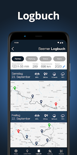 Fahrzeugvermächtnis mit allen Touren, Wartungsaktivitäten, Status- und Alarmmeldungen.