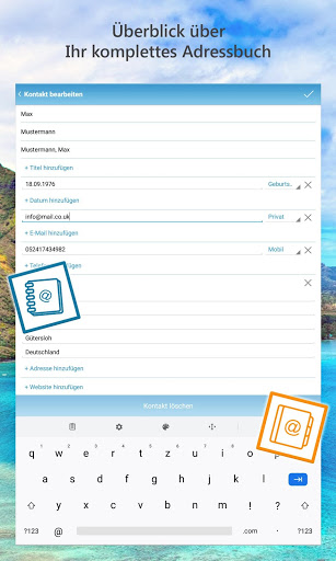 - Sicherer Zugriff auf Ihr Adressbuch. Legen Sie neue Kontakte über die App an, bearbeiten Sie diese und synchronisieren Sie diese direkt und automatisch mit Ihrem Webmail-Adressbuch