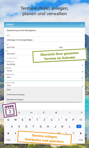 Diese App vereint die wichtigsten Funktionen der Kommunikation und ermöglicht Ihnen neben dem Empfang und Versand von E-Mails folgende weitere Möglichkeiten: