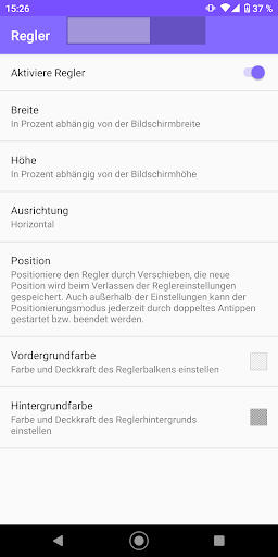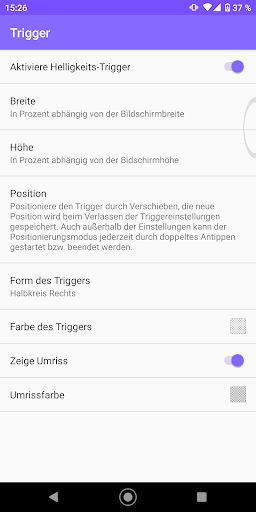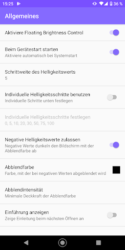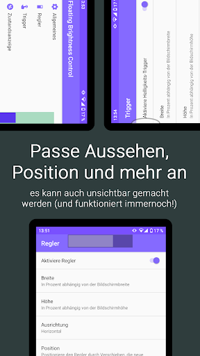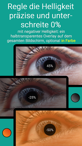 Der Helligkeitsregler kann frei platziert und die Farbe und Deckkraft angepasst werden. Der Regler lässt sich auch unsichtbar machen, die Helligkeit lässt sich nach wie vor regeln! Optional können auch negative Helligkeitswerte zugelassen werden. Dann wird der Bildschirm zusätzlich mit einer einstellbaren Abblendfarbe abgedunkelt.