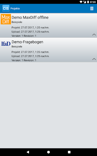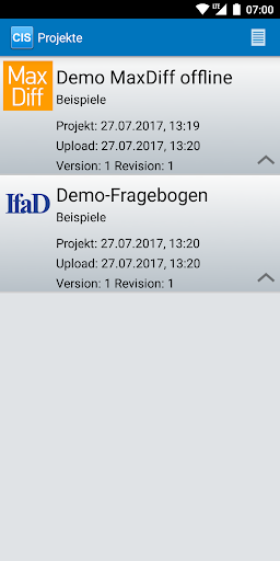 Für unsere Beispiel-Fragebogen laden Sie die App, drücken den Update-Button oben rechts, wählen “Projekte aktualisieren” und geben die folgenden Login-Daten ein:
