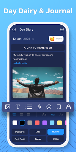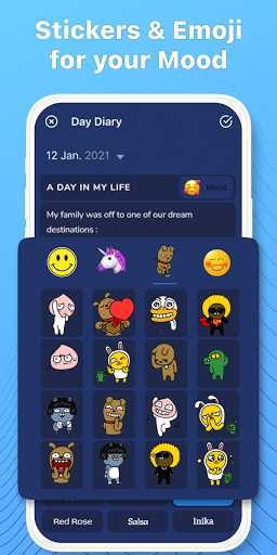 In diesem Tagebuch können Sie Ihr Tagebuch informativ machen, da es unterstützt, Themen, Aufkleber, Stimmung, Schriftart usw. zu unterstützen. Dies macht Ihr Tagebuch voller echter Emotionen.