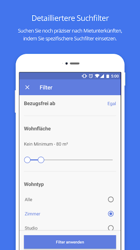 Passen Sie Ihre Suche an, indem Sie die angezeigten Mietwohnungen und -zimmer durch folgende Filter einschränken: Ort, Preis, Anzahl der Zimmer, Einzugsdatum, Größe der Unterkunft & mehr!