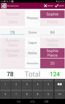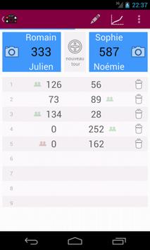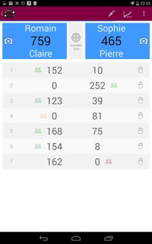 - Possibilité de saisir les points manuellement ou de prendre une photo des cartes pour calculer le score d'une équipe (fonction caméra disponible uniquement pour les appareils disposant d'au moins Android 3.0). Les performances de cette fonctionnalité peuvent dépendre de votre appareil et certains paquets de carte peuvent ne pas être reconnus