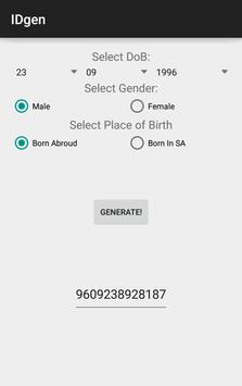 Generate South African ID numbers that conform to the Luhn algorithm. This app does not give real ID numbers, nor the names that may be associated with them, it is purely for testing and similar purposes.