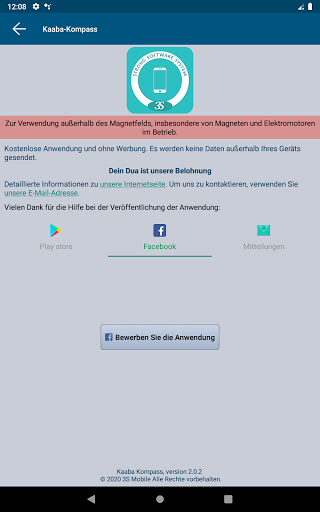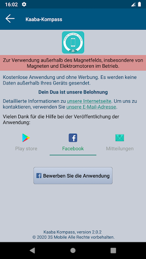 • Ihr Gerät ist mit einem Magnetfeldsensor ausgestattet, Es gibt nichts zu tun, die Richtung der Qibla wird automatisch gefunden. Wenn jedoch der Magnetsensor Ihres Geräts fehlerhaft oder nicht richtig kalibriert ist, ist diese Richtung unzuverlässig. Dieses Problem kann auch auftreten, wenn Sie sich in der Nähe einer Magnetfeldquelle oder einer metallischen Masse befinden.
