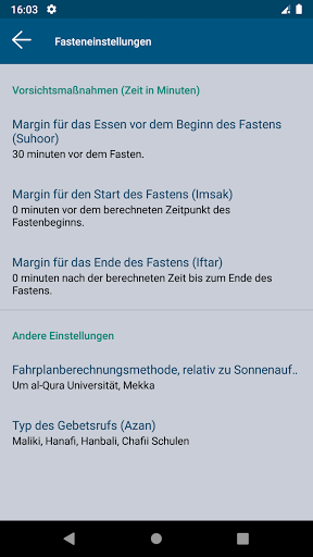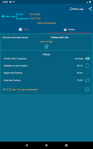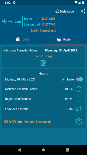 Die App berechnet für Sie jeden Tag die genauen Start- und Endzeiten des Fastens. Diese Berechnung wird automatisch basierend auf Ihrem geografischen Standort durchgeführt. Für Ihre Bequemlichkeit haben Sie die Möglichkeit: