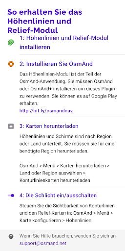 Dieses plugin bietet Konturlinien und Relief-Schattierung, die in OsmAnd Offline-Karten angezeigt werden können.