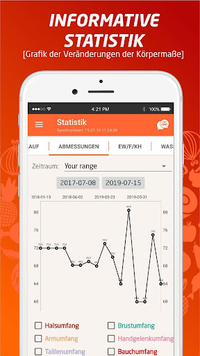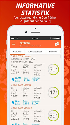 • Umfangreiche Statistiken über Aufnahme von Proteinen, Fetten, Kohlenhydraten und Kalorien, Kontrolle der Wasserzufuhr, Diagramme der Veränderungen im Gewicht und in den Körpermaßen, EW/F/KH-Verhältnisse.