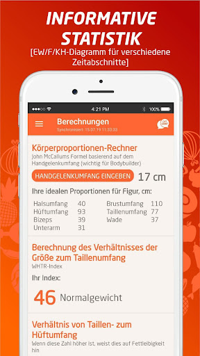• Eine Vielzahl der Berechnungen (Bestimmung des Kalorienbedarfs nach der Mifflin-St.-Jeor-Formel, Berechnung der Körperproportionen nach der John-McCallum-Formel, Berechnung der Relation von Körpergröße zur Taille nach dem WHTR-Index, Berechnung des Wasserbedarfs anhand Ihrer Parameter, BMI-Berechnung, Berechnung des Fettanteils im Körper usw.).