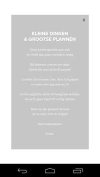 Deze app hoort bij het decembernummer van Creatie magazine: Kleine dingen en grootse plannen. In dit nummer staat namelijk een selectie werk geselecteerd door Frank de Ruwe van reclamebureau NATWERK. Loeigoeie afbeeldingen van ijzersterk werk, maar zonder tekst. In deze app zal Frank je er namelijk persoonlijk van alles over vertellen.