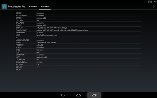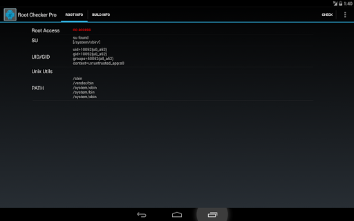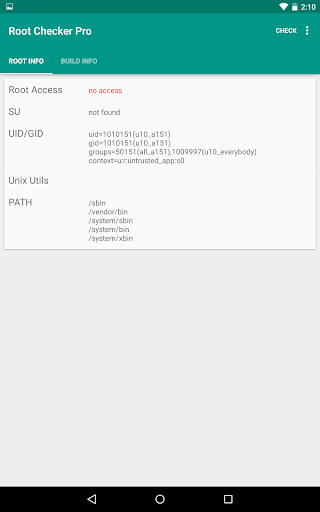 Registerkarte "Root Checker" gibt Ihnen einen einfachen und schnellen Weg, um zu überprüfen, ob Ihr Telefon "verwurzelt" ist. Optional gibt es auch eine detaillierte Information über SU- und BUSYBOX-Ausführbare Informationen.