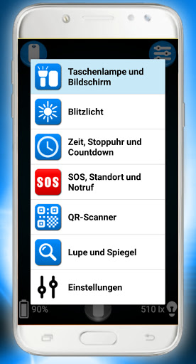 Taschenlampe und Display, Blitzlicht, Zeit- / Stoppuhr, SOS, QR-Scanner, Lupe und Spiegel.