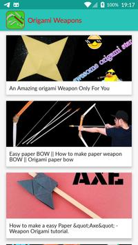 Wenn Sie Origami-Kunst mögen und erstaunliche Figuren aus Spielzeug-Origami-Waffen herstellen möchten, um Spaß beim Spielen mit normalem Papier zu haben, laden Sie diese App herunter und spielen Sie Schritt für Schritt mehr als 250 DIY-Videolektionen und Origami-Anweisungen für alle Handwerksstufen von Anfängern an Experten. Hier erfahren Sie, wie Sie Origami-Pistolen, Schwerter, Papierpistolen und andere Arten von Papierwaffen herstellen.