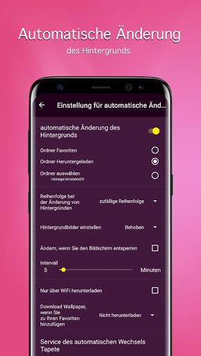 In der Anwendung wird eine automatische Hintergrundänderung Funktion (Live-Wallpaper) implementiert. Sie können die Quelle und das Intervall der Änderung selbst auswählen. Fügen Sie einfach die 4K Hintergründe zu Favoriten hinzu, ankreuzen Sie die entsprechende Position der Einstellungen und erfreuen Sie sich. Ihre allen gefallenden rosa Bilder werden sich auf dem Desktop und Sperrbildschirm im Wechsel ändern!