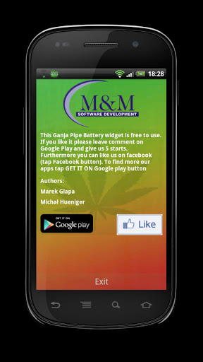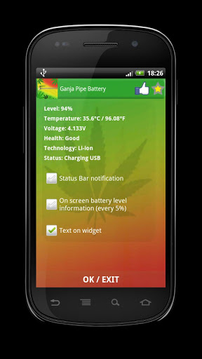 Ganja Pipe BatteryNew Ganja Pipe Battery. This one have ganja as theme. If you like themes related with marijuana, smoking weed and all this stuff, this widget is ideal for you. Essentials of every rastaman. Remember that marijuana is the drug in most countries.To add this widget to you home screen:1. tap and hold on free space2. chose Add Widget3. tap on Ganja Pipe Battery4. That is all, enjoy :Tap on Ganja Pipe Battery Widget to get more battery information Above it, you can find facebook button and follow us, and when you press at star, there is a link to Google Play where you can give us some opinion. Below additional battery info you can find check box. You can set there:1. Battery level information in notification bar.2. On screen info every each 5.3. Battery level text on widget.This free battery indicator is really lightweight and does not drain battery. Check our other apps. Widget have some useful features like: Onscreen info about current battery level, every 5. When you play games or browsing websites you can control when your battery is discharged. Info in notification. When you write sms, email using facebook listening to the music or anything else you have current battery level in notification bar. When press on Widget icon you can get more battery information like: temperature voltage, health, technology and current status.This free app is ad supported and may contain ads in the notification tray.