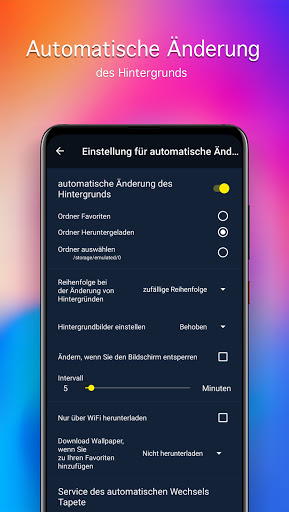 In der Anwendung wird eine automatische Hintergrundänderung Funktion (Live-Wallpaper) implementiert. Sie können die Quelle und das Intervall der Änderung selbst auswählen. Fügen Sie einfach die 4K Hintergründe zu Favoriten hinzu, ankreuzen Sie die entsprechende Position der Einstellungen und erfreuen Sie sich. Ihre allen gefallenden Bilder für POCO werden sich auf dem Desktop und Sperrbildschirm im Wechsel ändern!