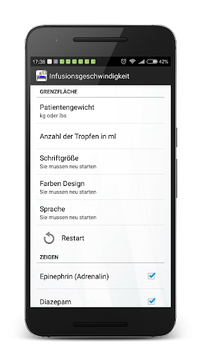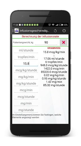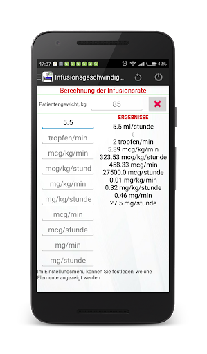 Das Programm erlaubt es, die Infusionsrate von Drogen zu berechnen. Dabei werden das Gewicht des Patienten und die verschiedenen Varianten der Verdünnung der Ausgangslösung berücksichtigt. Umrechnung von ml/h in mg/min, mg/kg(lb)/min, mg/kg(lb)/stunde, mcg/min, mcg/kg(lb)/min, mcg/kg(lb)/stunde, mcg/stunde ist schnell, einfach und erfolgt durch wenige Bildschirmberührungen. In den Einstellungen können Sie zwischen Kilogramm oder Pfund wählen.