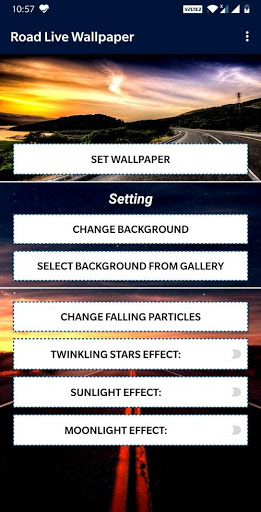 Sparkle and star : if you love sparkles, this app "Road Live Wallpaper" is for you. Just open the App "Road Live Wallpaper" , choose a beautiful road background from the pictures of road we have added,then go to particles and selects sparkle , now, you will see