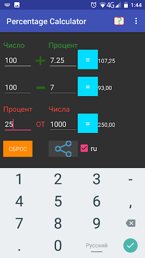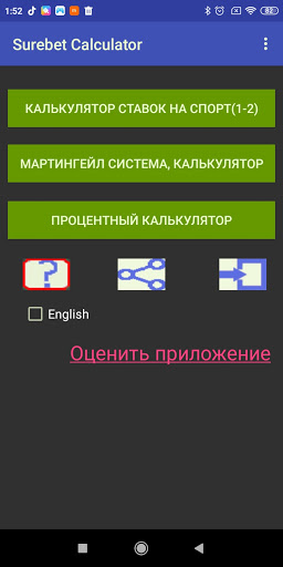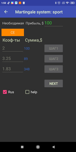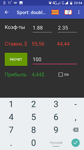 Macht die Berechnung der Werte "Gewinne" und "Wetten" auf bestimmte Koeffizienten für Sportveranstaltungen (Dezimalformat). Einfach, verständlich und einfach zu bedienen. Berechnungen, Sie Benötigen Sie keinen Zugang zum Internet.
