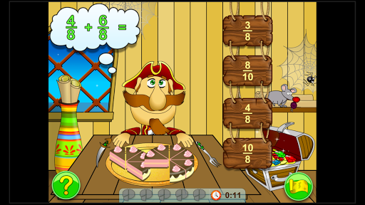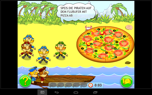 Das Spiel besteht aus vier Teilen. Jeder Teil entspricht einer Insel. Auf der ersten Insel lernt man die Bedeutung von Brüchen kennen. Biete den einen Piraten einen Teil von der Pizza an, und errate wieviel für die anderen Piraten übrig bleibt. Aber Vorsicht. Wenn du einen Fehler machst, sind alle bis zum Hals in Schwierigkeiten!