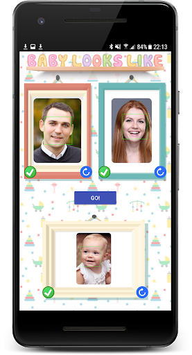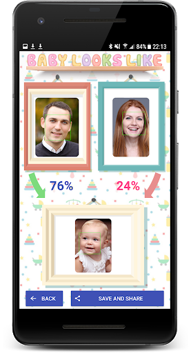 Use the simple interface to add photos of Mummy, Daddy and Baby. Then click 'Go' to see a percentage score of who your baby looks like.
