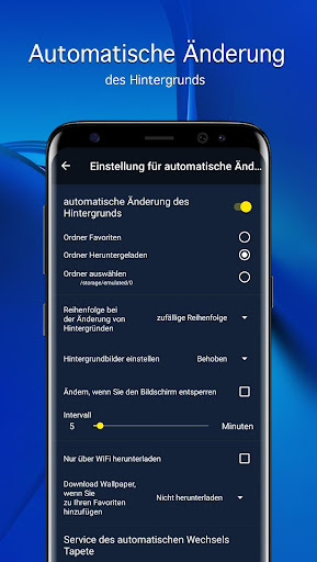 In der Anwendung wird eine automatische Hintergrundänderung Funktion (Live-Wallpaper) implementiert. Sie können die Quelle und das Intervall der Änderung selbst auswählen. Fügen Sie einfach die 4K Hintergründe zu Favoriten hinzu, ankreuzen Sie die entsprechende Position der Einstellungen und erfreuen Sie sich. Ihre allen gefallenden Bilder für Samsung werden sich auf dem Desktop und Sperrbildschirm im Wechsel ändern!