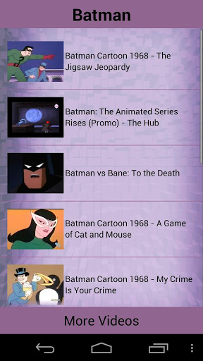 Enjoy CHILDHOOD memories The most loved Super Hero cartoons ever Featuring... Batman Captain America Daredevil HellBoy Hulkiron Man Spider Man Super Man The Maskquot;BEST APPLICATION FOR YOUR KIDSquot;Please rate the app if u like it...DISCLAIMER : The content of this app are powered by youtube This app just provides links to access the videos in an organized way and we are not responsible for any copyright issues as the app gives access to YOUTUBE videos AVAILABLE ON PUBLIC DOMAIN as is.For more videos please visit http:m.youtube.comquot;gt;youtube