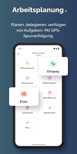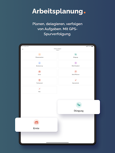 Erstelle, delegiere und dokumentiere Arbeiten wie Pflanzenschutz, Düngen, Bewäserung, Baumschnitt usw. mit deinem Mobiltelefon.