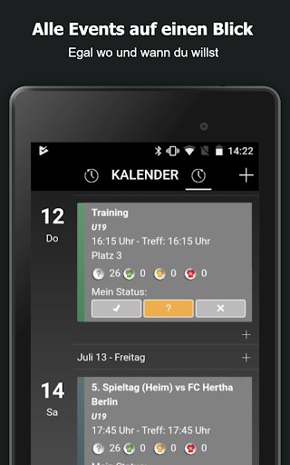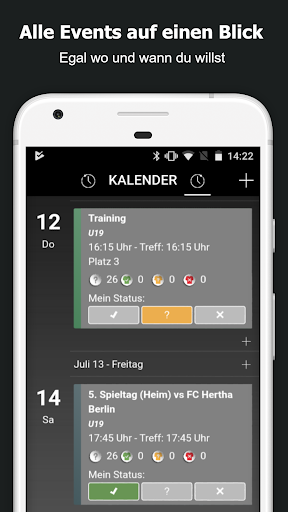 Fußballmannschaften verwalten, Trainingstage planen, Spielaufstellungen und Spielaktionen erfassen, Turniere & allgemeine Termine hinterlegen, Zu/Absagen live verfolgen, Spielberichte & Trainingspläne im Team teilen, Mannschaftskasse führen, Aufgaben zuweisen, Abstimmungen durchführen und vieles mehr.