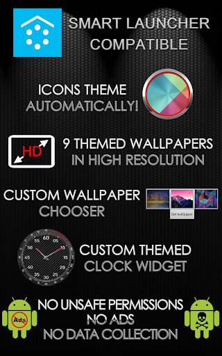 Wichtig! Das Smart Launcher Carbon Clock-Widget, das Sie in den Screenshots sehen, ist im Thema enthalten. Sie können es im Smart Launcher aus der Liste System Wigdet auswählen (Stellen Sie sicher, dass Sie die App nicht auf die SD-Karte verschoben haben).