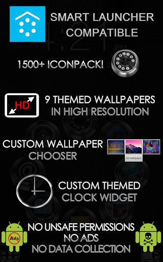 Smart Launcher Thema. Extrem detailliertes und hochwertiges elegantes und modernes Smart Launcher-Theme mit High-Definition-Grafiken Automatik-Themen-Symbole, 9 benutzerdefinierte Themen-HD-Wallpapers und ein Metall-Takt-Widget, um selbst in Geräten mit den Bildschirmen mit höchster Auflösung sehr detaillierte und definierte Grafiken zu ergeben. Alles ist mit metallischen Texturen, Beleuchtungseffekten, Reflexionen und Farbverläufen auf das letzte Detail br> ✔ 1500 Iconpack mit hoher Auflösung Icons und alle anderen Symbole auto-Thema selbst Symbol Maskierung automatisch durch.