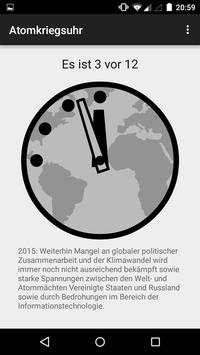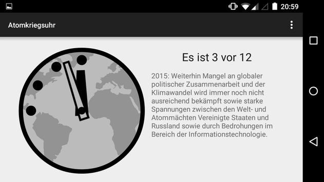 Des Weiteren wirst du benachrichtigt, wenn sich die Zeit der Atomkriegsuhr ändert (lässt sich in den Einstellungen der App abschalten). Um in Zukunft Benachrichtigungen zu erhalten, muss die App nach der Installation (bzw nach dem installieren des neusten Updates) einmalig geöffnet werden.