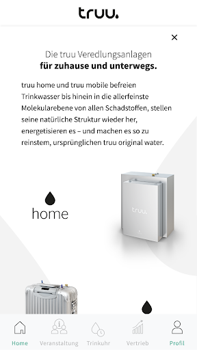 Steig ein in die Welt von truu oder verwalte dein office als truu expert/owner. Für alle Interessierten liefert die App erste Informationen über reinstes, ursprünglichstes truu original water. Zugleich kannst du dir einen ersten Überblick über die Systeme verschaffen, mit denen du zellverfügbares truu original water für dich selbst herstellen kannst – ob zuhause, unterwegs oder im Büro.