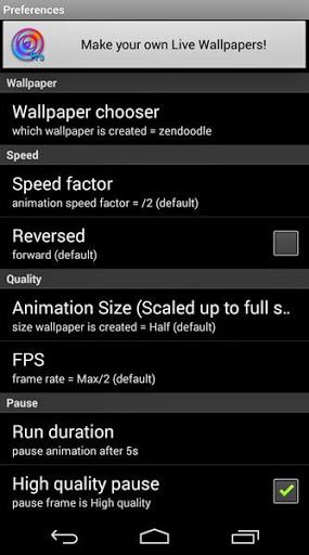 Another distinctive feature of SourcesWP is the fact that it can be made to pause after a certain amount of time and draw the last frame as a high quality still image. As well as preserving precious battery life this means you get a live wallpaper and an ever-varying still wallpaper in one! Any time you want to resume the animation - simply double tap.